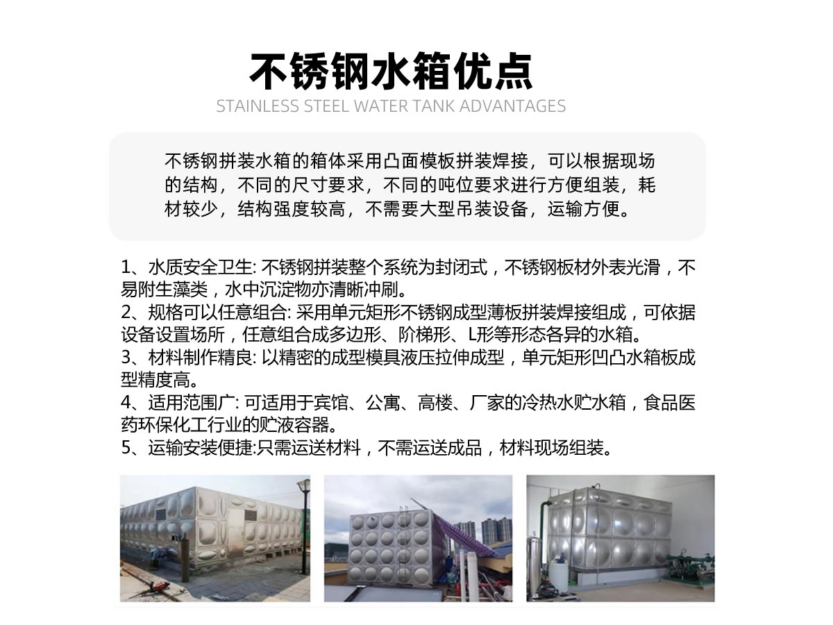 金管道304不锈钢水箱冲压板源头厂家不锈钢水箱组合板材,聚氨酯保温,模块焊接,冲压b板厂家不锈钢水箱是继玻璃水箱之后新一代水箱产品,采用SUS304不锈钢板精工模压而成,造型美观、经济实用、主体经久不坏。具有重量轻、强度高、耐腐蚀、耐高温、水质清洁,防渗,抗震,永不生青苔,安装方便,无需维修,便于清洗等诸多优点。